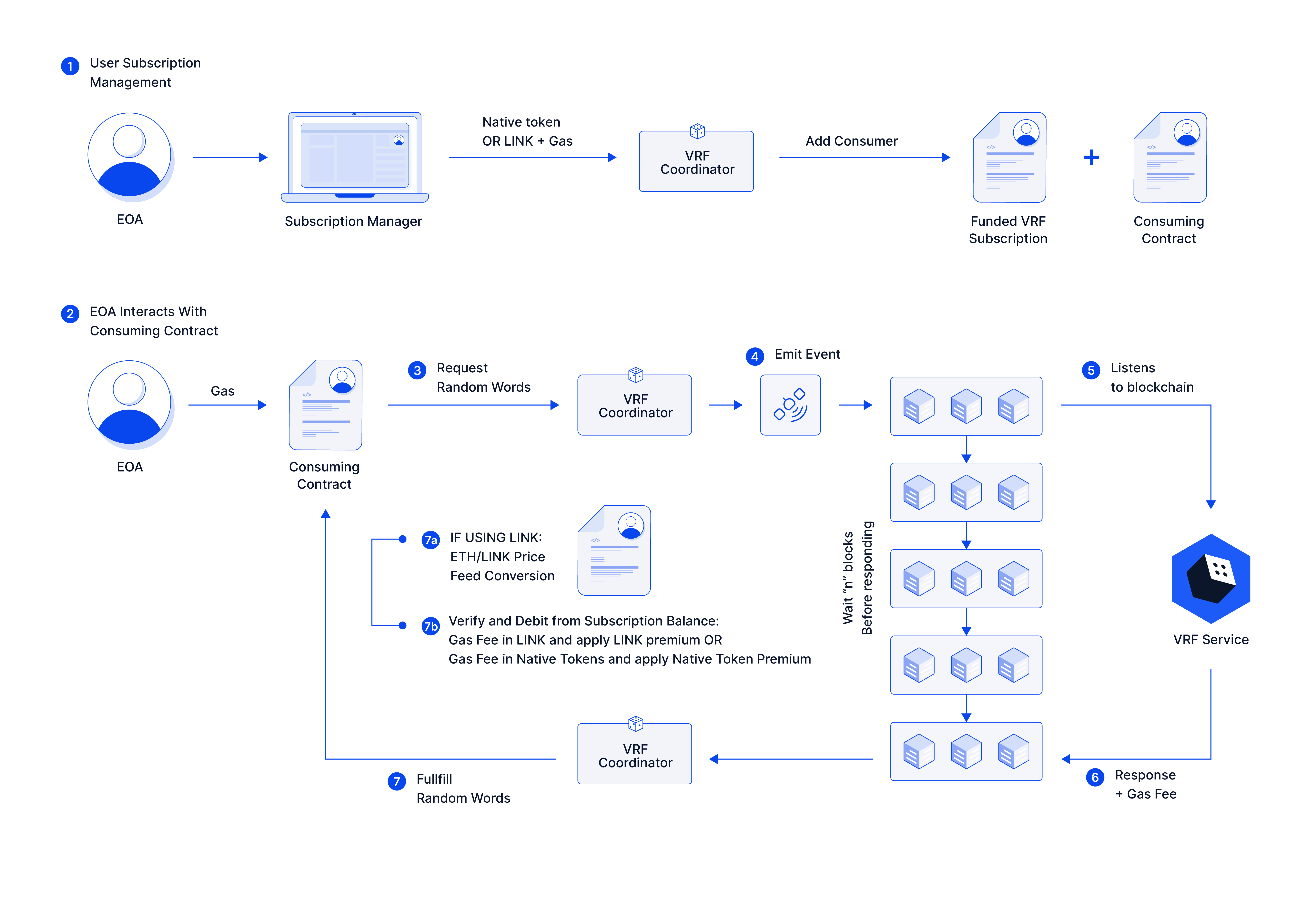 • VRF service (offchain component): Listens for requests by subscribing to the VRF Coordinator event logs and calculates a random number based on the block hash and nonce. The VRF service then sends a transaction to the VRFCoordinator including the random number and a proof of how it was generated.